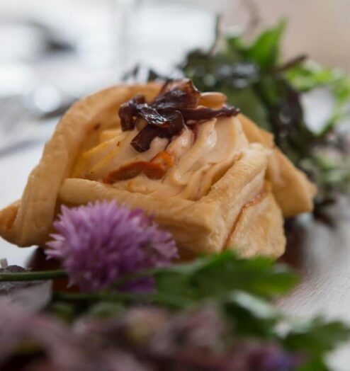 Elegant pastry dish on a wooden platter with fresh herbs, creating a gourmet dining experience.