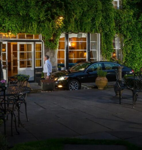 A welcoming couple arrives at a charming ivy-covered hotel entrance, assisted by staff.